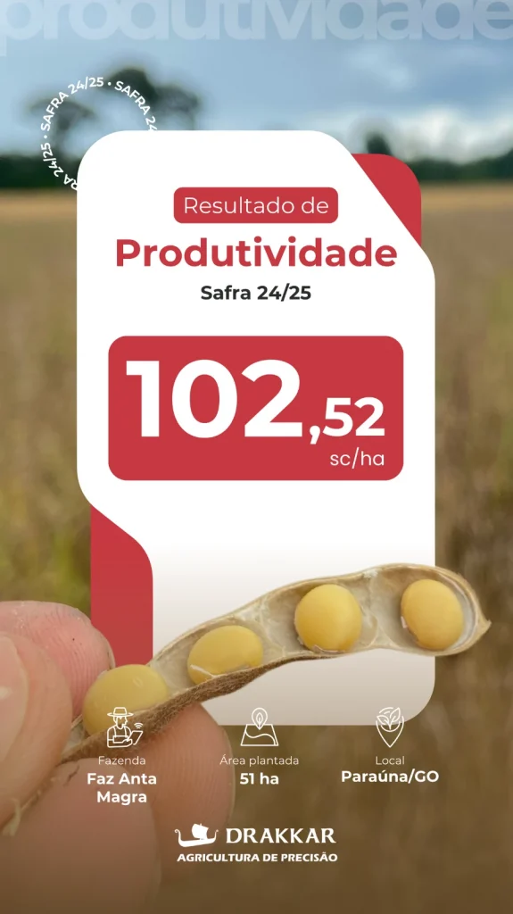 O trabalho gerou uma produtividade de 102,52 sacas de soja por hectare, reforçando a posição da Fazenda Anta Magra como referência em Paraúna e validando a Agricultura de Precisão como caminho para resultados consistentes.